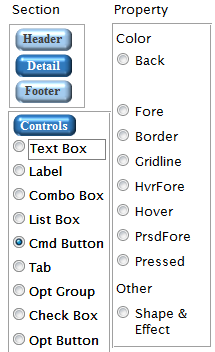 The example shows Command Buttons selected for the Detail Section. Command Buttons have the greatest range of Color options, including a Hover Background and Hover Foreground. In addition Shapes & Effects are available.