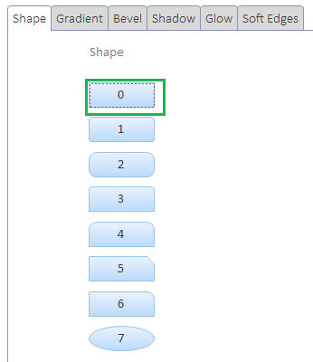 If a control has Shapes or Effects then clicking the option will dislay a form allowing selections. From the Shapes form multiple settings can be made with an Apply button showing the overall result on the sample form.