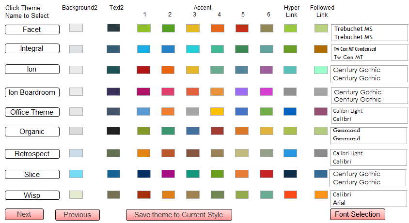 The Themes tab shows a list of the named Themes on your system with a sample of each color and font. Microsoft provided 38 Themes with Access 2010, but provided only 8 different themes with Access 2013 and 9 with 2016. Each version has the Predefined Office Theme. if you don't like the appearance of the Fonts associated with the theme the themes Tab gives access to a Font selector form to choose alternatives.