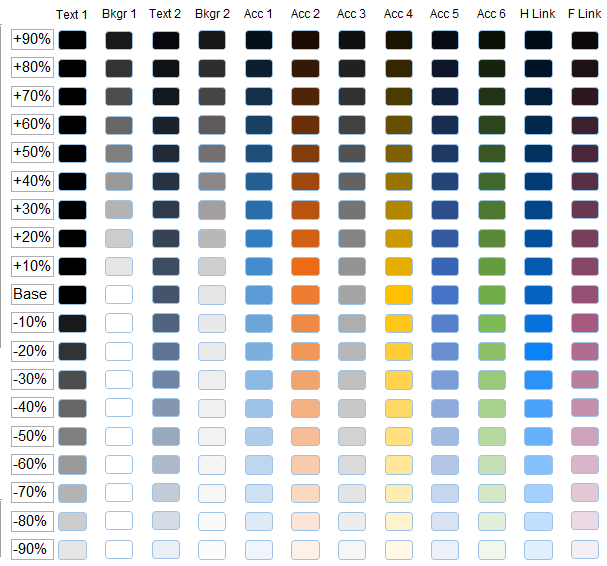 The central section of the Advanced tab is the color picker. Microsoft's color picker allows only 5 variations on each of the main theme colors, that hides the reality of there being 100 lighter variations and 100 darker variations for each theme color. ThemeMyDatabase gives you easy access to all the variations with instant display on the Sample form.